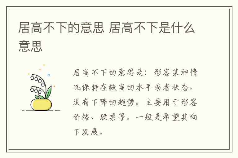 居高不下的意思 居高不下是什么意思 知识分享 1月25日 编辑 童画 取消关注 关注 私信 居高不下,汉语成语,读音为:jūgāo búxià 意思是:形容某种情况保持在较高的水平或者状态,没有下降的趋势。主要用于形容价格、股票等。一般是希望其向下发展。 成语的近义词为:居高临下水涨船高 反义词为:一成不变 成语造句:虽然现在工作场所的禁烟令几乎无处不在,但总体上的吸烟率仍然居高不下。 No related posts. 本文内容由互联网用户自发贡献,该文观点仅代表作者本人。本站仅提供信息存储空间服务,不拥有所有权,不承担相关法律责任。如发现本站有涉嫌抄袭侵权/违法违规的内容, 请发送邮件至 2245678901@qq.com 举报,一经查实,本站将立刻删除。 给TA打赏 共{{data.count}}人 人已打赏