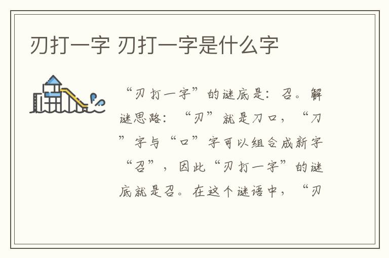 “刃打一字”的谜底是:召。解谜思路:“刃”就是刀口,“刀”字与“口”字可以组合成新字“召”,因此“刃打一字”的谜底就是召。在这个谜语中,“刃”是谜面,“打一字”是谜目,“召”字是谜底。