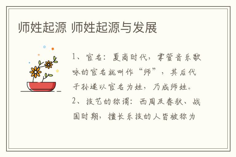 师姓的起源:1、官名:夏商时代,掌管音乐歌咏的官名就叫作“师”,其后代子孙遂以官名为姓,乃成师姓。2、技艺的称谓:西周及春秋、战国时期,擅长乐技的人皆被称为师,其后代子孙以先祖的职业技能称谓为姓氏,世代相传至今。3、少数民族汉化改姓:清朝以后,蒙古人姓巴克西纳尔氏、巴戈西纳儿氏者,改汉字姓均为师。