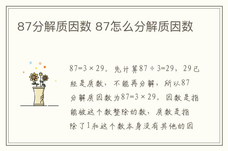 87分解质因数 87怎么分解质因数 知识分享 2月3日 编辑 童画 取消关注 关注 私信 87分解质因数是87=3×29。 先计算87÷3=29,29已经是质数,不能再分解,所以87分解质因数为87=3×29。 因数是指能被这个数整除的数,质数是指除了1和这个数本身没有其他的因数。分解质因数的意思是将一个正整数写成几个质数相乘的形式,这几个能整除该正整数的质数就叫做这个正整数的质因数。 No related posts. 本文内容由互联网用户自发贡献,该文观点仅代表作者本人。本站仅提供信息存储空间服务,不拥有所有权,不承担相关法律责任。如发现本站有涉嫌抄袭侵权/违法违规的内容, 请发送邮件至 2245678901@qq.com 举报,一经查实,本站将立刻删除。 给TA打赏 共{{data.count}}人 人已打赏