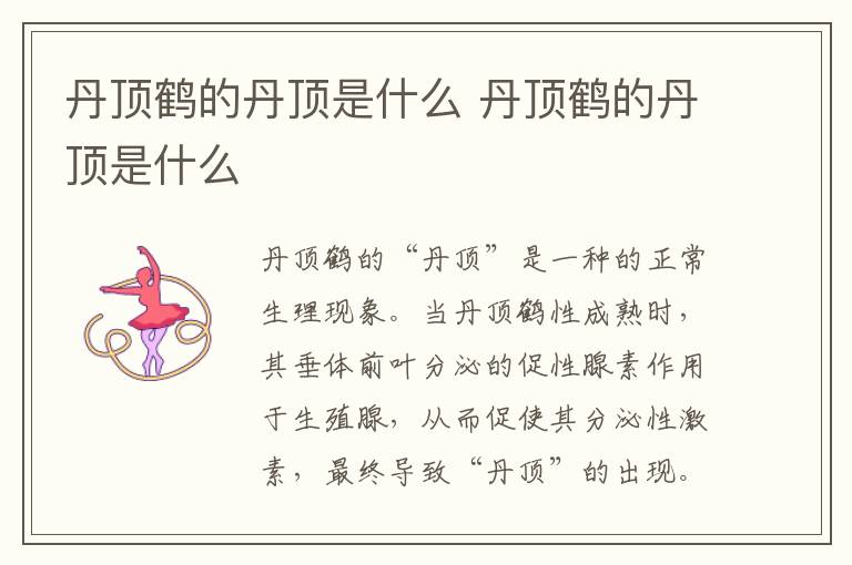 丹顶鹤的“丹顶”是一种的正常生理现象。当丹顶鹤性成熟时,其垂体前叶分泌的促性腺素作用于生殖腺,从而促使其分泌性激素,最终导致“丹顶”的出现。一般来说,在春季的发情时期,“丹顶”的颜色鲜艳,面积也会更大,冬季则较小。丹顶鹤的情绪与健康状况也会影响“丹顶”的大小。
