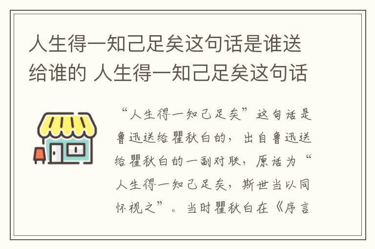 “人生得一知己足矣”这句话是鲁迅送给瞿秋白的,出自鲁迅送给瞿秋白的一副对联,原话为“人生得一知己足矣,斯世当以同怀视之”。当时瞿秋白在《序言》中高度评价了鲁迅的杂文,后来两人相互赏识,鲁迅就写了这副对联答谢瞿秋白。