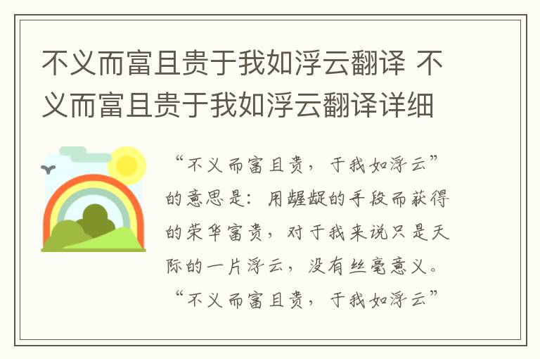 “不义而富且贵,于我如浮云”的意思是:用龌龊的手段而获得的荣华富贵,对于我来说只是天际的一片浮云,没有丝毫意义。“不义而富且贵,于我如浮云”句子出自论语节选。原文欣赏:子曰:“饭疏食饮水,曲肱而枕之,乐亦在其中矣。不义而富且贵,于我如浮云。”翻译:孔子说:“吃粗粮,喝冷水,弯着胳膊当枕头,乐趣也就在其中了。用不正当的手段得来的富贵,对于我来讲就像是天上的浮云一样。”