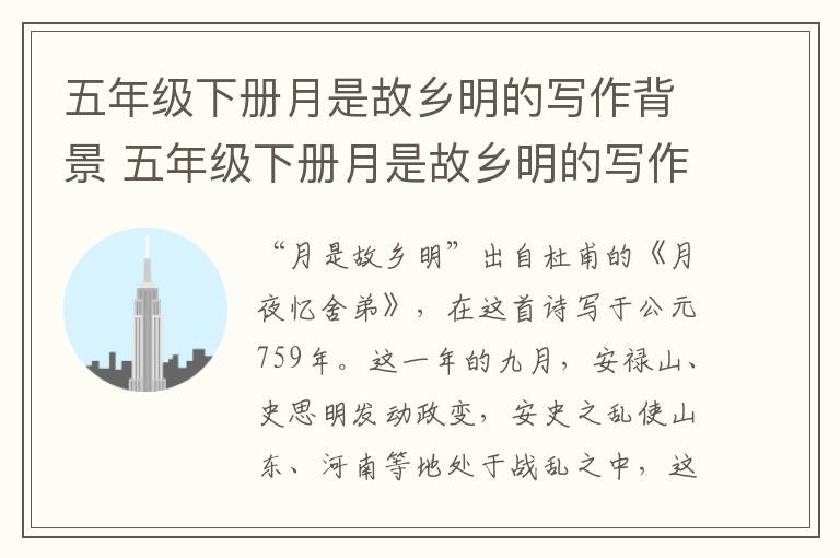 “月是故乡明”出自杜甫的《月夜忆舍弟》,在这首诗写于公元759年。这一年的九月,安禄山、史思明发动政变,安史之乱使山东、河南等地处于战乱之中,这时杜甫和几位弟弟正分散在这一带,因为战事阻隔,音信不通,诗人心中十分忧虑,由于思念弟弟,身在秦州的杜甫就写下了这首诗。