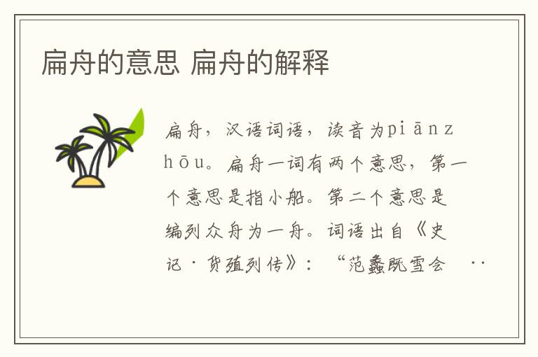 扁舟,汉语词语,读音为piān zhōu。扁舟一词有两个意思,第一个意思是指小船。第二个意思是编列众舟为一舟。词语出自《史记·货殖列传》:“范蠡既雪会稽之耻,乃喟然而叹曰:‘计然之策七,越用其五而得意。