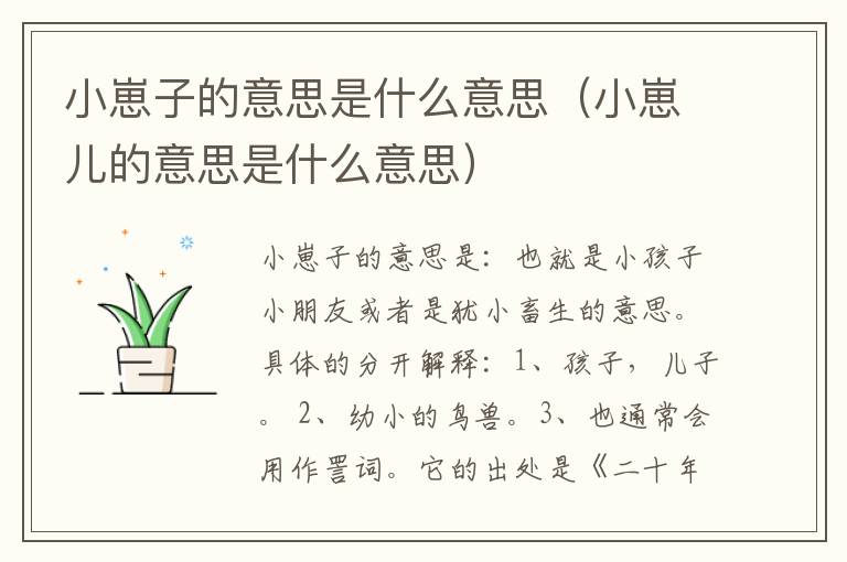 小崽子的意思是:也就是小孩子小朋友或者是犹小畜生的意思。具体的分开解释:1、孩子,儿子。2、幼小的鸟兽。3、也通常会用作詈词。它的出处是《二十年目睹之怪现状》的第八七回里面苟太太说道:今天先扭死了你这小崽子再说。