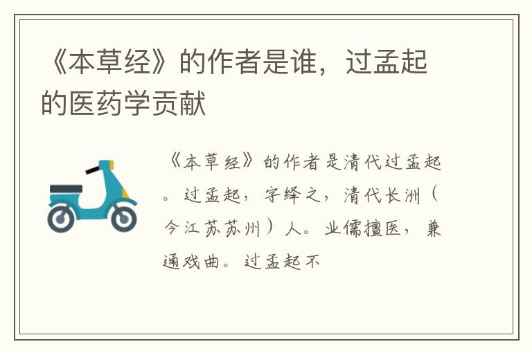 《本草经》的作者是清代过孟起。过孟起,字绎之,清代长洲(今江苏苏州)人。业儒擅医,兼通戏曲。过孟起不仅关注文学戏曲,对于医药学的贡献更为突出。过孟起祖籍苏州府长洲县,常年在邻近的苏州府吴县光福里行医,属苏州人无疑。