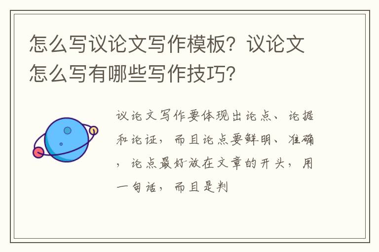 议论文写作要体现出论点、论据和论证,而且论点要鲜明、准确,论点最好放在文章的开头,用一句话,而且是判断句式,把中心论点都摆出来,同时文章内容结构要严谨,逻辑性也要强,议论文的语言必须是准确、生动符合逻辑。