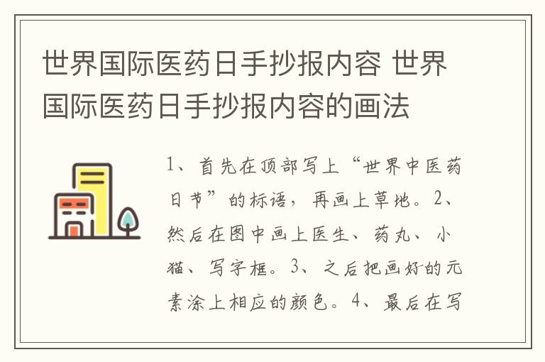 世界国际医药日手抄报内容 世界国际医药日手抄报内容的画法 知识分享 2月5日 编辑 童画 取消关注 关注 私信 1、首先在顶部写上“世界中医药日节”的标语,再画上草地。 2、然后在图中画上医生、药丸、小猫、写字框。 3、之后把画好的元素涂上相应的颜色。 4、最后在写字框内写上文字即可。 No related posts. 本文内容由互联网用户自发贡献,该文观点仅代表作者本人。本站仅提供信息存储空间服务,不拥有所有权,不承担相关法律责任。如发现本站有涉嫌抄袭侵权/违法违规的内容, 请发送邮件至 2245678901@qq.com 举报,一经查实,本站将立刻删除。 给TA打赏 共{{data.count}}人 人已打赏