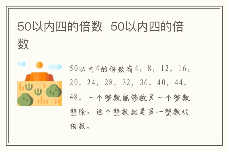 50以内四的倍数 50以内四的倍数 知识分享 1月25日 编辑 童画 取消关注 关注 私信 50以内4的倍数有4,8,12,16,20,24,28,32,36,40,44,48。 一个整数能够被另一个整数整除,这个整数就是另一整数的倍数。一个数除以另一数所得的商。如a÷b=c,就是说,a是b的倍数。一个数的倍数有无数个,也就是说一个数的倍数的集合为无限集。 No related posts. 本文内容由互联网用户自发贡献,该文观点仅代表作者本人。本站仅提供信息存储空间服务,不拥有所有权,不承担相关法律责任。如发现本站有涉嫌抄袭侵权/违法违规的内容, 请发送邮件至 2245678901@qq.com 举报,一经查实,本站将立刻删除。 给TA打赏 共{{data.count}}人 人已打赏