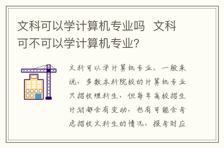 文科可以学计算机专业。一般来说,多数本科院校的计算机专业只招收理科生,但每年高校招生计划都会有变动,也有可能会考虑招收文科生的情况,报考时应该根据高校的招生简章来确定。专科院校一般对文理限制较少,文科生可以选择计算机专业文理兼收的学校。