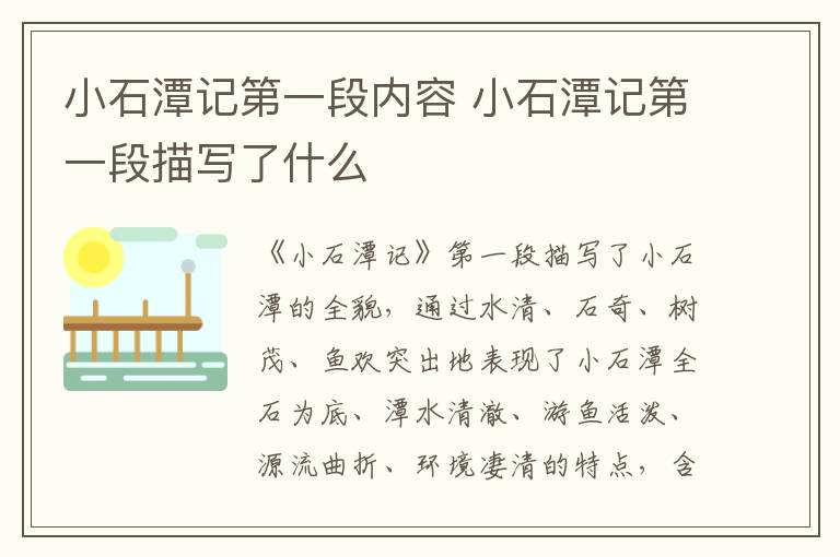 《小石潭记》第一段描写了小石潭的全貌,通过水清、石奇、树茂、鱼欢突出地表现了“小石潭”全石为底、潭水清澈、游鱼活泼、源流曲折、环境凄清的特点,含蓄地抒发了作者在寂寞处境中悲凉凄怆的心绪。