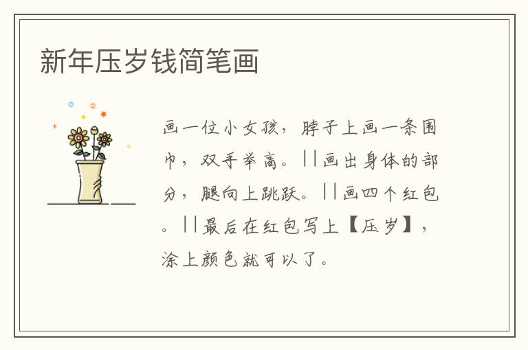 新年压岁钱简笔画 知识分享 1月31日 编辑 童画 取消关注 关注 私信 1、画一位小女孩,脖子上画一条围巾,双手举高。 2、画出身体的部分,腿向上跳跃。 3、画四个红包。 4、最后在红包写上【压岁】,涂上颜色就可以了。 No related posts. 本文内容由互联网用户自发贡献,该文观点仅代表作者本人。本站仅提供信息存储空间服务,不拥有所有权,不承担相关法律责任。如发现本站有涉嫌抄袭侵权/违法违规的内容, 请发送邮件至 2245678901@qq.com 举报,一经查实,本站将立刻删除。 给TA打赏 共{{data.count}}人 人已打赏