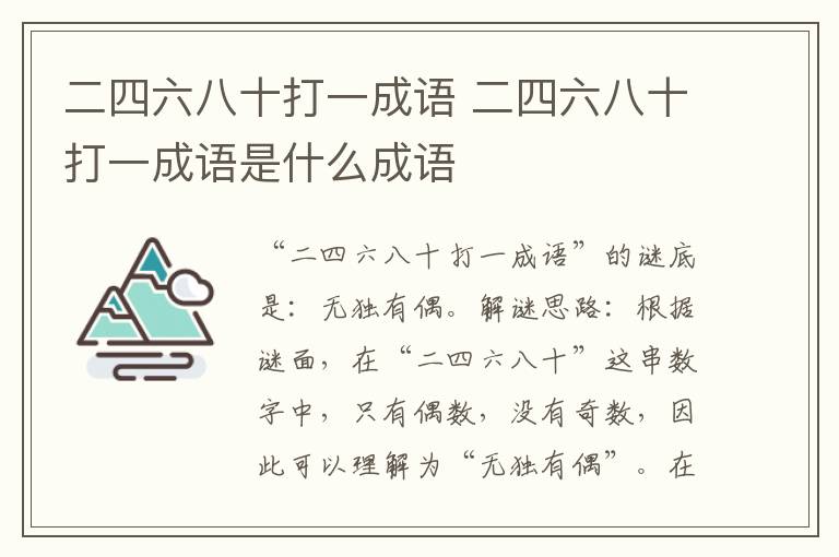 “二四六八十打一成语”的谜底是:无独有偶。解谜思路:根据谜面,在“二四六八十”这串数字中,只有偶数,没有奇数,因此可以理解为“无独有偶”。在这个谜语中,“二四六八十”是谜面,“打一成语”是谜目,谜底是衙。