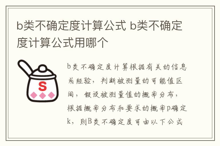 b类不确定度计算根据有关的信息或经验,判断被测量的可能值区间,假设被测量值的概率分布,根据概率分布和要求的概率p确定k,则B类不确定度可由以下公式:ub=a/k。
