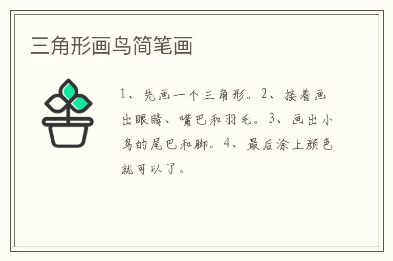 三角形画鸟简笔画 知识分享 2月7日 编辑 童画 取消关注 关注 私信 1、先画一个三角形。 2、接着画出眼睛、嘴巴和羽毛。 3、画出小鸟的尾巴和脚。 4、最后涂上颜色就可以了。 No related posts. 本文内容由互联网用户自发贡献,该文观点仅代表作者本人。本站仅提供信息存储空间服务,不拥有所有权,不承担相关法律责任。如发现本站有涉嫌抄袭侵权/违法违规的内容, 请发送邮件至 2245678901@qq.com 举报,一经查实,本站将立刻删除。 给TA打赏 共{{data.count}}人 人已打赏