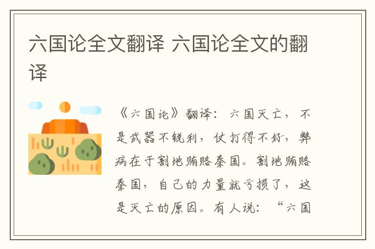 《六国论》翻译:六国灭亡,不是武器不锐利,仗打得不好,弊病在于割地贿赂秦国。割地贿赂秦国,自己的力量就亏损了,这是灭亡的原因。有人说:“六国相继灭亡,全都是由于割地贿赂秦国吗?”回答说:“不割地贿赂秦国的国家因为割地贿赂秦国的国家而灭亡。因为他们失去了强有力的外援,不能单独保全。所以说:‘弊病在于割地贿赂秦国’啊!”