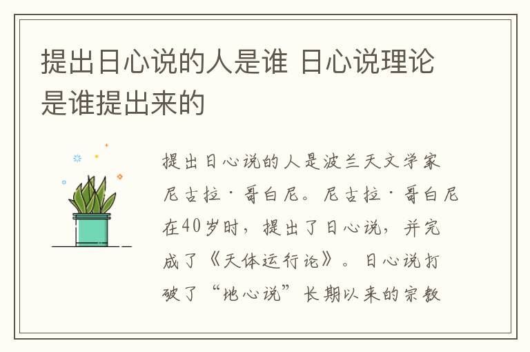 提出日心说的人是波兰天文学家尼古拉·哥白尼。尼古拉·哥白尼在40岁时,提出了日心说,并完成了《天体运行论》。日心说打破了“地心说”长期以来的宗教统治地位,实现了天文学的根本变革。