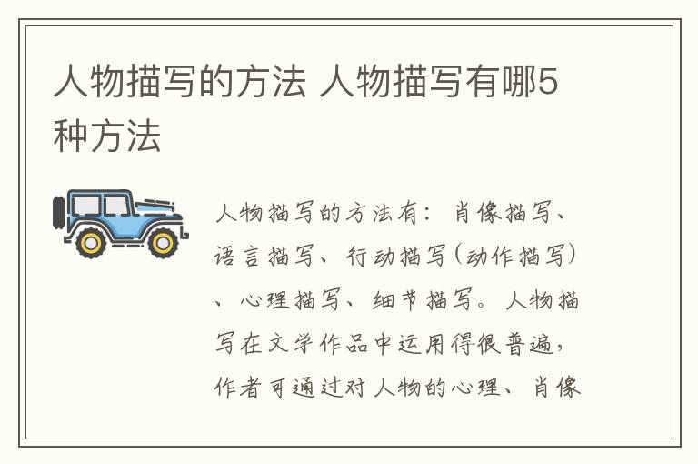 人物描写的方法有五种,分别是肖像描写、语言描写、行动描写(动作描写)、心理描写、细节描写。人物描写在文学作品中运用得很普遍,作者可通过对人物的心理、肖像、语言等描写,来反映人物的性格,表现人物的精神面貌等,从而表达作品的中心思想。