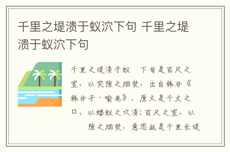 千里之堤溃于蚁泬下句 千里之堤溃于蚁泬下句 知识分享 2月3日 编辑 童画 取消关注 关注 私信 千里之堤溃于蚁泬下句是百尺之室,以突隙之烟焚,出自韩非《韩非子·喻老》。原文是千丈之堤,以蝼蚁之穴溃;百尺之室,以突隙之烟焚,意思就是千里长堤可能会因为蚁穴而崩塌,百尺大的房子可能因为烟囱冒出的火星而被大火吞噬烧毁。一般用来比喻一个小细节酿成的大祸造成严重的损失。 No related posts. 本文内容由互联网用户自发贡献,该文观点仅代表作者本人。本站仅提供信息存储空间服务,不拥有所有权,不承担相关法律责任。如发现本站有涉嫌抄袭侵权/违法违规的内容, 请发送邮件至 2245678901@qq.com 举报,一经查实,本站将立刻删除。 给TA打赏 共{{data.count}}人 人已打赏