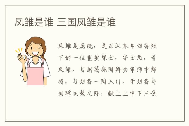 凤雏是庞统,是东汉末年刘备帐下的一位重要谋士,字士元,号凤雏,与诸葛亮同拜为军师中郎将。与刘备一同入川,于刘备与刘璋决裂之际,献上上中下三条计策,刘备用其中计。进围雒县时,庞统率众攻城,不幸中流矢而亡,年仅三十六岁。