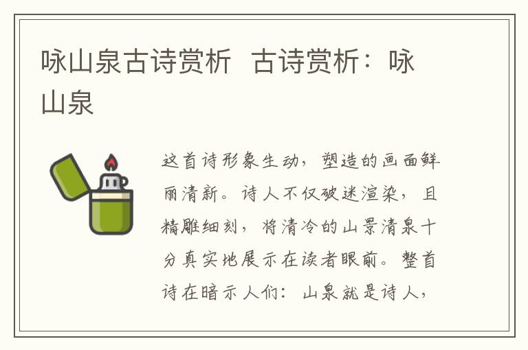 咏山泉古诗赏析 古诗赏析:咏山泉 知识分享 1月31日 编辑 童画 取消关注 关注 私信 这首诗形象生动,塑造的画面鲜丽清新。诗人不仅破迷渲染,且精雕细刻,将清冷的山景清泉十分真实地展示在读者眼前。整首诗在暗示人们:山泉就是诗人,山泉的特征就是诗人想要追求的个性,即向往恬静自然,飘逸出俗。 No related posts. 本文内容由互联网用户自发贡献,该文观点仅代表作者本人。本站仅提供信息存储空间服务,不拥有所有权,不承担相关法律责任。如发现本站有涉嫌抄袭侵权/违法违规的内容, 请发送邮件至 2245678901@qq.com 举报,一经查实,本站将立刻删除。 给TA打赏 共{{data.count}}人 人已打赏