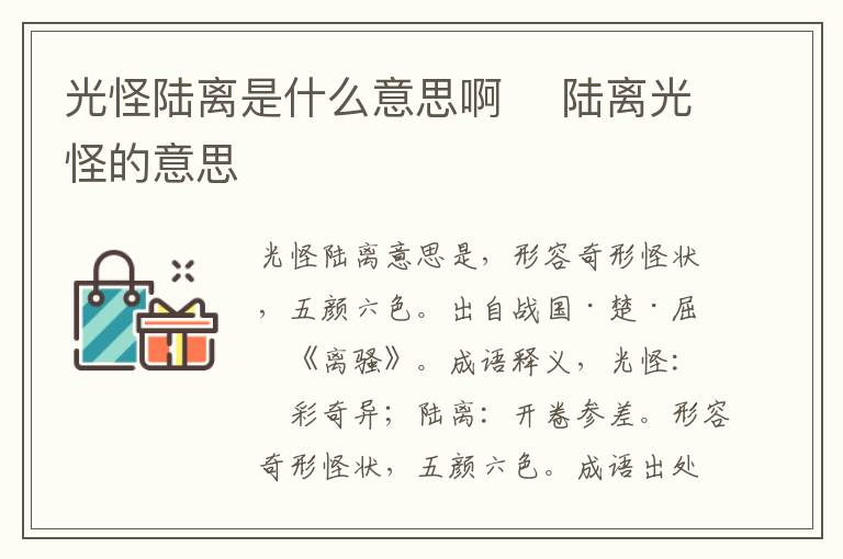 光怪陆离意思是,形容奇形怪状,五颜六色。出自战国·楚·屈原《离骚》。成语释义,光怪:光彩奇异;陆离:开卷参差。形容奇形怪状,五颜六色。成语出处:战国·楚·屈原《离骚》:“纷总总其离合兮,斑陆离其上下”。