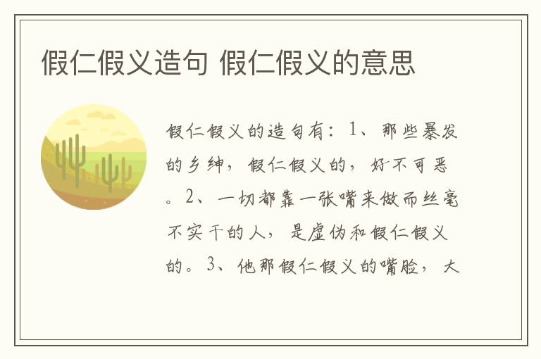 假仁假义的造句有:1、那些暴发的乡绅,假仁假义的,好不可恶。2、一切都靠一张嘴来做而丝毫不实干的人,是虚伪和假仁假义的。3、他那假仁假义的嘴脸,大家早就看不惯了。4、他是一个假仁假义的人。