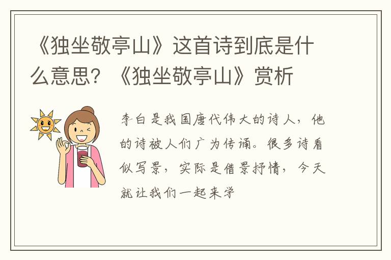 李白是我国唐代伟大的诗人,他的诗被人们广为传诵。很多诗看似写景,实际是借景抒情,今天就让我们一起来学习一下他写的《独坐敬亭山》这首诗吧,看看这首诗到底是什么意思呢?