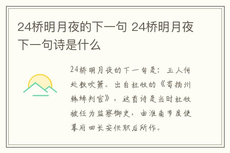 24桥明月夜的下一句是:玉人何处教吹箫。出自杜牧的《寄扬州韩绰判官》,这首诗是当时杜牧被任为监察御史,由淮南节度使幕府回长安供职后所作。