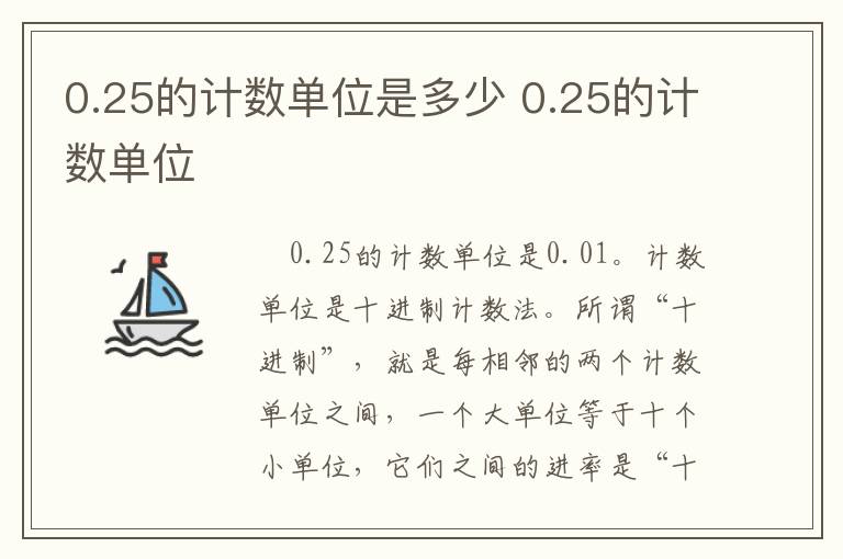 0.25的计数单位是0.01。计数单位是十进制计数法。所谓“十进制”,就是每相邻的两个计数单位之间,一个大单位等于十个小单位,它们之间的进率是“十”。