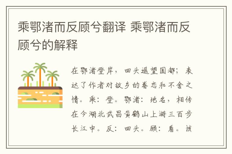 “乘鄂渚而反顾兮”这句话的意思是在鄂渚登岸,回头遥望国都;表达了作者对故乡的眷恋和不舍之情。乘:登。鄂渚:地名,相传在今湖北武昌黄鹤山上游三百步长江中。反:回头。顾:看。该句出自战国时期楚国诗人屈原的《九章·涉江》。