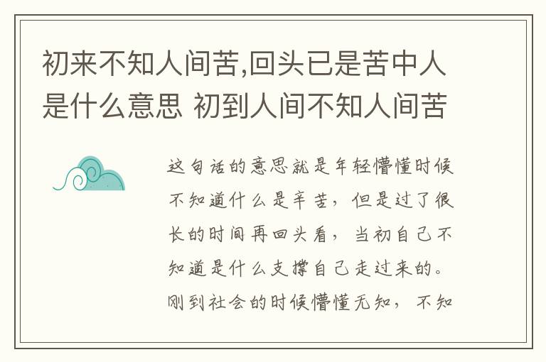 这句话的意思就是年轻懵懂时候不知道什么是辛苦,但是过了很长的时间再回头看,当初自己不知道是什么支撑自己走过来的。刚到社会的时候懵懂无知,不知道人间生活有多苦,但是时间流逝最后发现,自己也成为了其中一部分。
