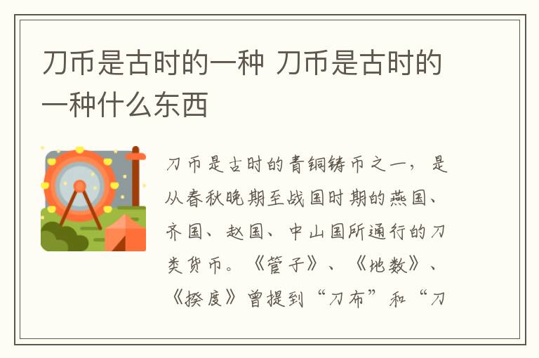 刀币是古时的青铜铸币之一,是从春秋晚期至战国时期的燕国、齐国、赵国、中山国所通行的刀类货币。《管子》、《地数》、《揆度》曾提到“刀布”和“刀币”。刀币的形状由春秋时期的农具、手工工具和日常用具演变而成。