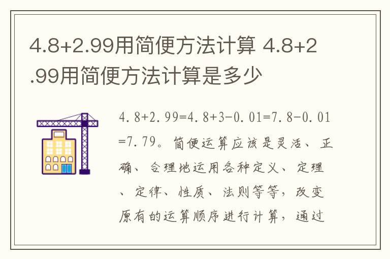 简便运算应该是灵活、正确、合理地运用各种定义、定理、定律、性质、法则等等,改变原有的运算顺序进行计算,通过简便运算要大幅度地提高计算速度及正确率,使复杂的计算变得简单。简便计算是一种特殊的计算方式,它运用了数字的基本性质以及运算的定律,以达到让计算变得便捷的目的。常用的简便计算的方法有加法结合律、加法交换律、乘法结合律、乘法分配律、乘法交换律。在4.8+2.99的简便运算中,运用的是加法结合律。