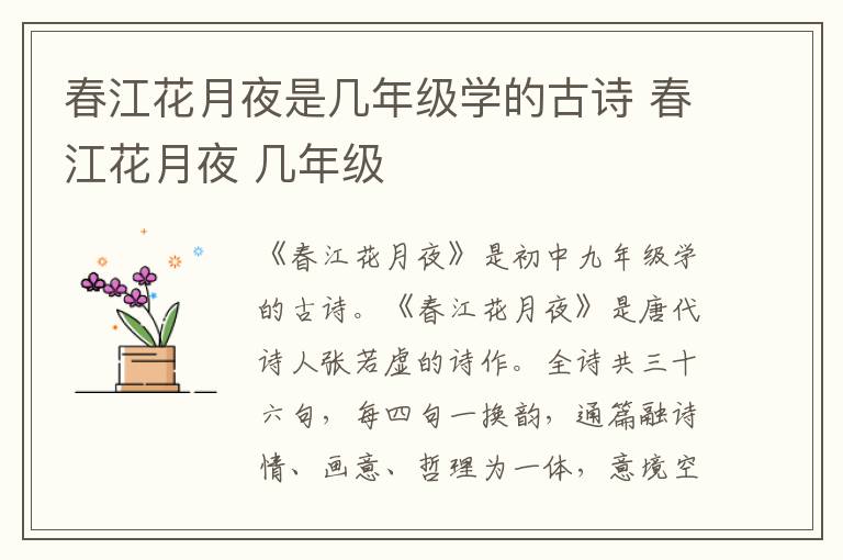 《春江花月夜》是初中九年级学的古诗。《春江花月夜》是唐代诗人张若虚的诗作。全诗共三十六句,每四句一换韵,通篇融诗情、画意、哲理为一体,意境空明,想象奇特,语言自然隽永,韵律宛转悠扬,洗净了六朝宫体的浓脂腻粉,具有极高的审美价值,素有“孤篇盖全唐”之誉。