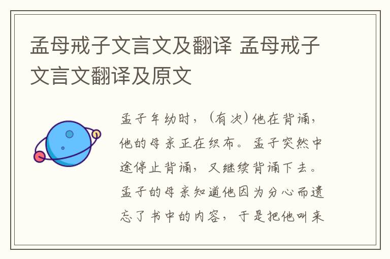 (这时)孟子的母亲拿起刀割断了布,以这件事作为警告。从那件事以后,孟子不再因分心而遗忘书中的内容了。
