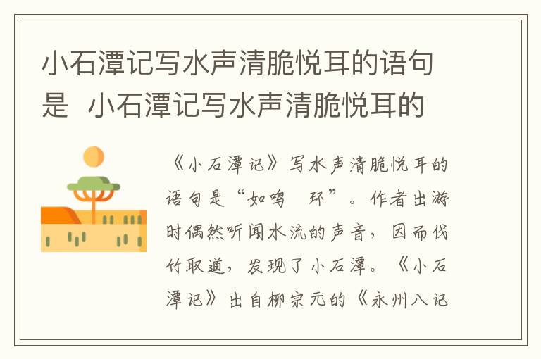 《小石潭记》写水声清脆悦耳的语句是“如鸣珮环”。作者出游时偶然听闻水流的声音,因而伐竹取道,发现了小石潭。《小石潭记》出自柳宗元《永州八记》中的一篇,通过对小石潭幽深冷寂的景色的描绘,传达出作者被贬后孤凄悲凉的心境。