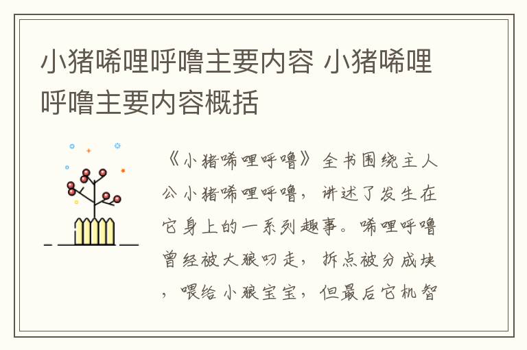 《小猪唏哩呼噜》全书围绕主人公小猪唏哩呼噜,讲述了发生在它身上的一系列趣事。唏哩呼噜曾经被大狼叼走,拆点被分成块,喂给小狼宝宝,但最后它机智地逃脱了,还战胜了月牙熊,保护了小狼们;小猪唏哩呼噜曾为鸭太太做保镖、一个人到城里送鸭蛋,还帮过鸡太太捉鬼。