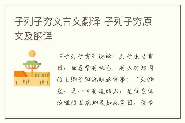 《子列子穷》翻译:列子生活贫困,面容常有饥色。有人对郑国的上卿子阳说起这件事:“列御寇,是一位有道的人,居住在你治理的国家却是如此贫困,你恐怕不喜欢贤达的士人吧?”子阳立即派官吏送给列子米粟。列子见到派来的官吏,再三辞谢不接受子阳的赐予。