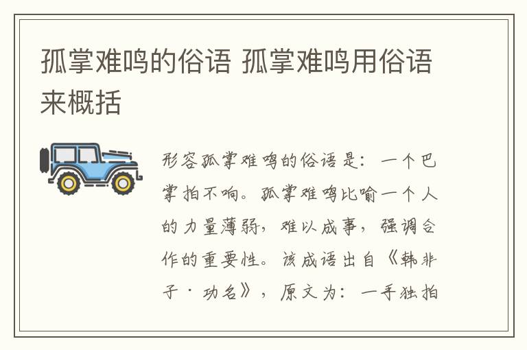 形容孤掌难鸣的俗语是:一个巴掌拍不响。孤掌难鸣比喻一个人的力量薄弱,难以成事,强调合作的重要性。该成语出自《韩非子·功名》,原文为:一手独拍;虽疾无声。“一个巴掌拍不响”是中国传统民间俗语。比喻矛盾和纠纷不是单方面引起的。