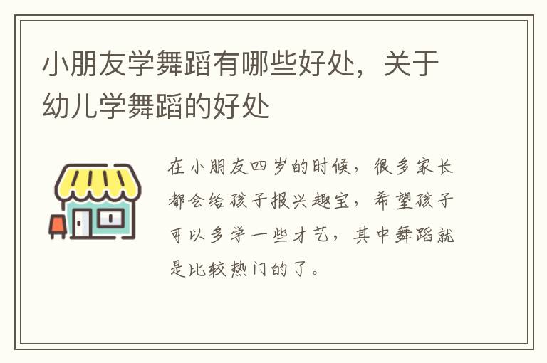 在小朋友四岁的时候,很多家长都会给孩子报兴趣宝,希望孩子可以多学一些才艺,其中舞蹈就是比较热门的了。今天就让我们来看看小朋友学舞蹈有哪些好处吧。