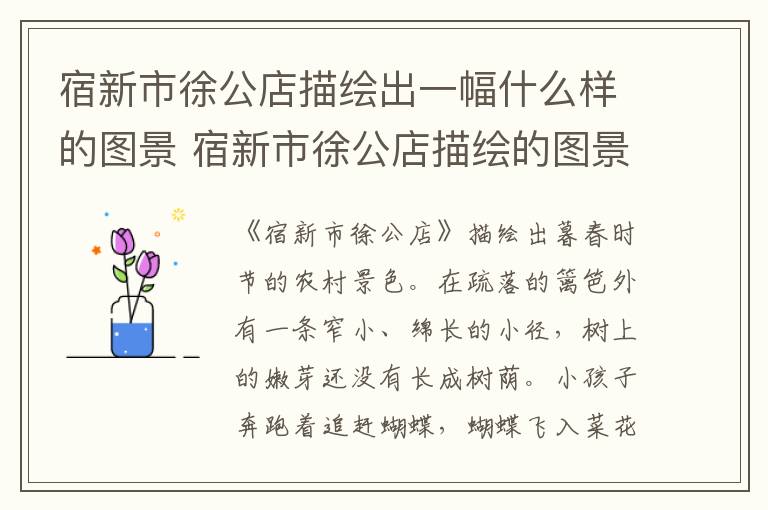 《宿新市徐公店》描绘出暮春时节的农村景色。在疏落的篱笆外有一条窄小、绵长的小径,树上的嫩芽还没有长成树荫。小孩子奔跑着追赶蝴蝶,蝴蝶飞入菜花丛中就找不到了。