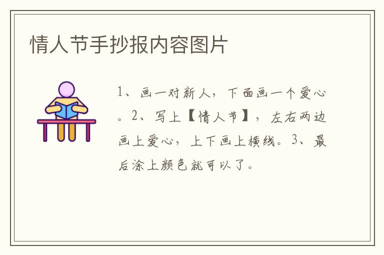 情人节手抄报内容图片 知识分享 2月3日 编辑 童画 取消关注 关注 私信 1、画一对新人,下面画一个爱心。 2、写上【情人节】,左右两边画上爱心,上下画上横线。 3、最后涂上颜色就可以了。 No related posts. 本文内容由互联网用户自发贡献,该文观点仅代表作者本人。本站仅提供信息存储空间服务,不拥有所有权,不承担相关法律责任。如发现本站有涉嫌抄袭侵权/违法违规的内容, 请发送邮件至 2245678901@qq.com 举报,一经查实,本站将立刻删除。 给TA打赏 共{{data.count}}人 人已打赏