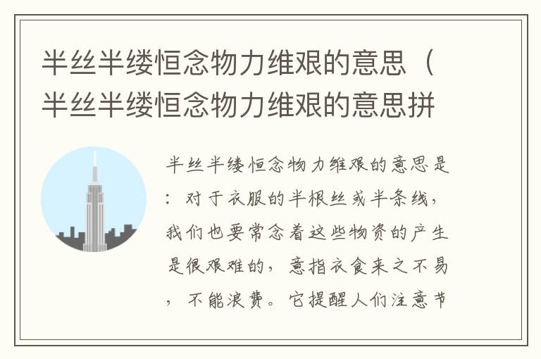 半丝半缕恒念物力维艰的意思是:对于衣服的半根丝或半条线,我们也要常念着这些物资的产生是很艰难的,意指衣食来之不易,不能浪费。它提醒人们注意节约用度珍惜劳动果实。