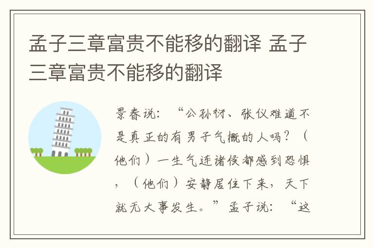 译文:景春说:“公孙衍、张仪难道不是真正的有男子气概的人吗?(他们)一生气连诸侯都感到恐惧,(他们)安静居住下来,天下就无大事发生。”孟子说:“这哪里能算得上是男子气概的人呢?你没有学习过礼吗?男人进行加冠之礼的时候,父亲给予教导;女子要嫁出去的时候,母亲给予教导。”