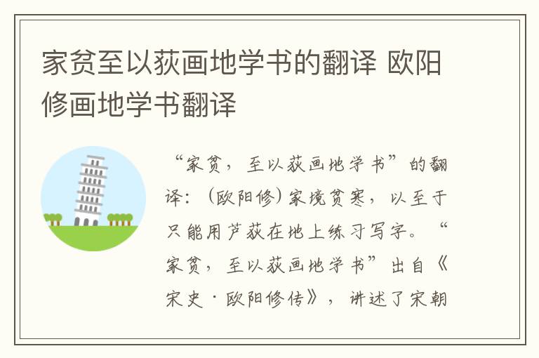 “家贫,至以荻画地学书”的翻译:(欧阳修)家境贫寒,以至于只能用芦荻在地上练习写字。“家贫,至以荻画地学书”出自《宋史·欧阳修传》,讲述了宋朝文学家欧阳修年幼时因为家贫而用荻杆在地上练习写字的故事。