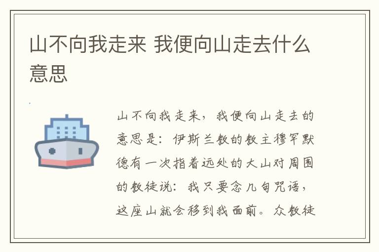 山不向我走来 我便向山走去的意思是:伊斯兰教的教主穆罕默德有一次指着远处的大山对周围的教徒说:我只要念几句咒语,这座山就会移到我面前。众教徒不信,穆罕默德便开始念念有词起来。结果山还在那里,动都不动。穆教主觉得出丑了,就腾腾腾地跑到山跟前。然后对着众教徒说:山不就我,我便去就山。