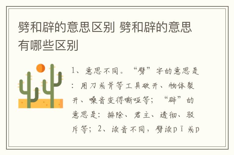 劈和辟的意思区别 劈和辟的意思有哪些区别 知识分享 2月3日 编辑 童画 取消关注 关注 私信 “劈”字的意思是:用刀或斧等工具砍开、物体裂开、嗓音变得嘶哑等; “辟”的意思是:排除、君主、透彻、驳斥等。 两者的区别有:1、意思不同;2、读音不同,劈读pī或pǐ,辟读bì、pī或pì;3、写法不同,劈有15笔画,辟有13笔画。 No related posts. 本文内容由互联网用户自发贡献,该文观点仅代表作者本人。本站仅提供信息存储空间服务,不拥有所有权,不承担相关法律责任。如发现本站有涉嫌抄袭侵权/违法违规的内容, 请发送邮件至 2245678901@qq.com 举报,一经查实,本站将立刻删除。 给TA打赏 共{{data.count}}人 人已打赏