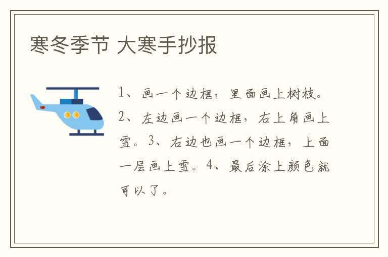 寒冬季节 大寒手抄报 知识分享 2月3日 编辑 童画 取消关注 关注 私信 1、画一个边框,里面画上树枝。 2、左边画一个边框,右上角画上雪。 3、右边也画一个边框,上面一层画上雪。 4、最后涂上颜色就可以了。 No related posts. 本文内容由互联网用户自发贡献,该文观点仅代表作者本人。本站仅提供信息存储空间服务,不拥有所有权,不承担相关法律责任。如发现本站有涉嫌抄袭侵权/违法违规的内容, 请发送邮件至 2245678901@qq.com 举报,一经查实,本站将立刻删除。 给TA打赏 共{{data.count}}人 人已打赏